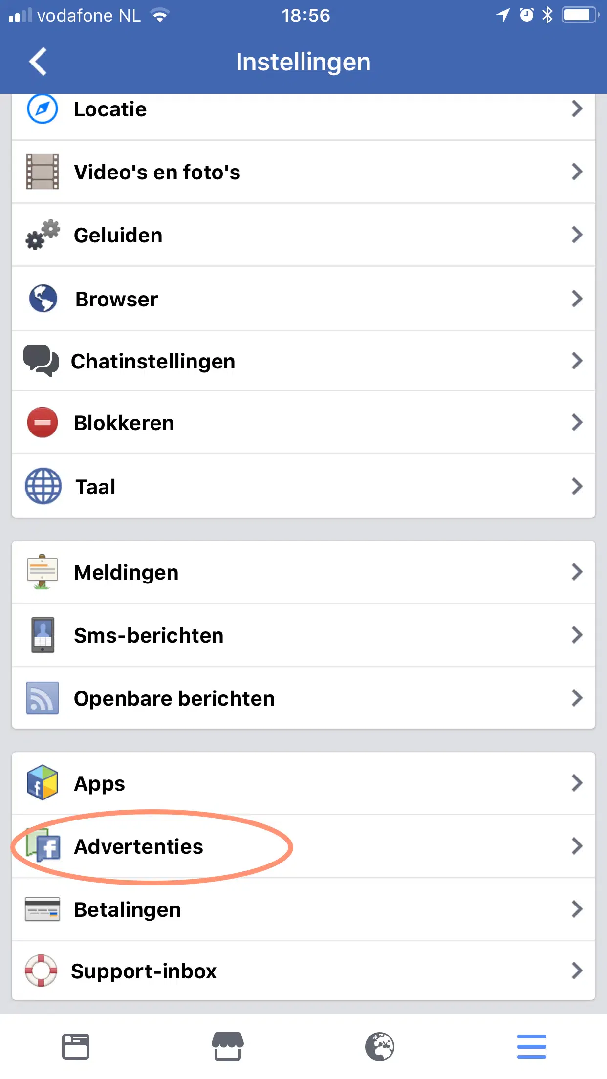 Open de Facebook app op je telefoon, ga onderin bij de 3 horizontale streepjes naar het menu.
