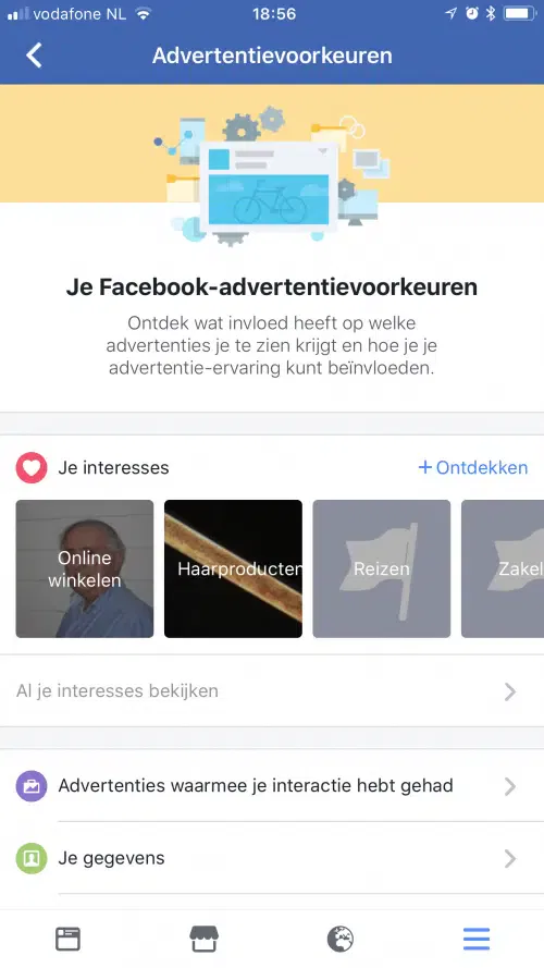 Hier kan je je advertentie voorkeuren aangeven en de Advertenties zien waarmee je interactie hebt gehad (handig als je het nog even terug wilt zien).