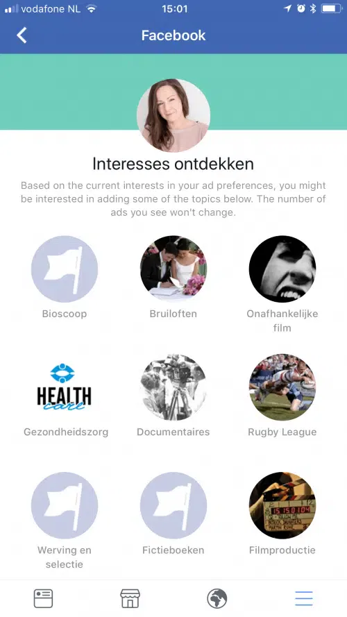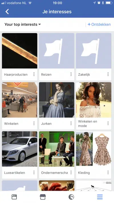 Bij Je Interesses > + Ontdekken zie je de interesses waarvan Facebook denkt dat ze bij je passen en kan je ze ook toevoegen.