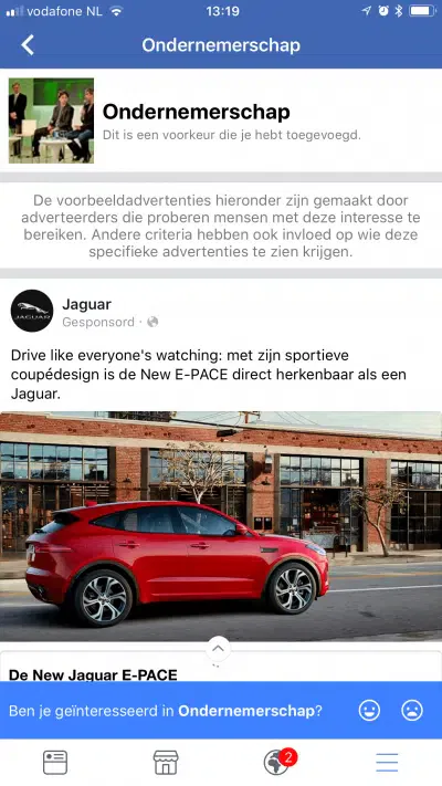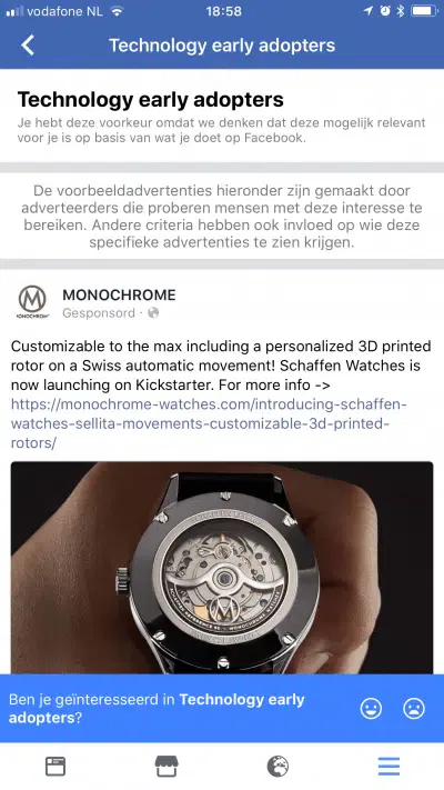 Je ziet vervolgens een advertentie binnen dit interessegebied. Facebook kan hier nog extra vragen of je echt interesse hebt in deze categorie. Op basis van een 🙂 of 🙁 kan je de voorkeur aangeven.