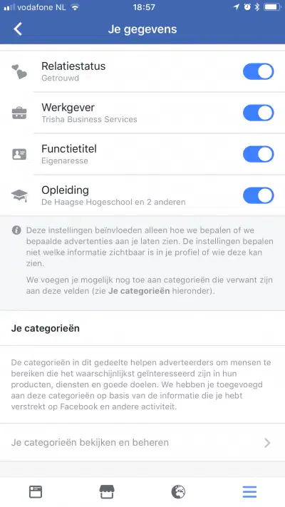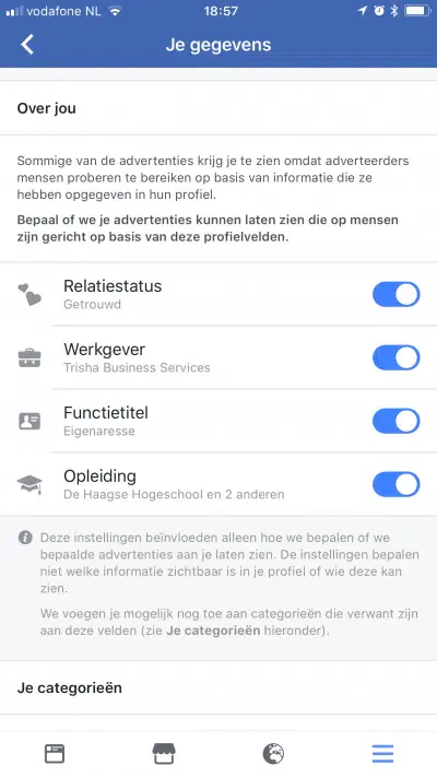 Bij Je gegevens kan je aangeven dat adverteerders bepaalde dingen niet van je mogen gebruiken om je te bereiken met hun advertenties, zoals je relatiestatus – dit kan je per onderdeel uit zetten.