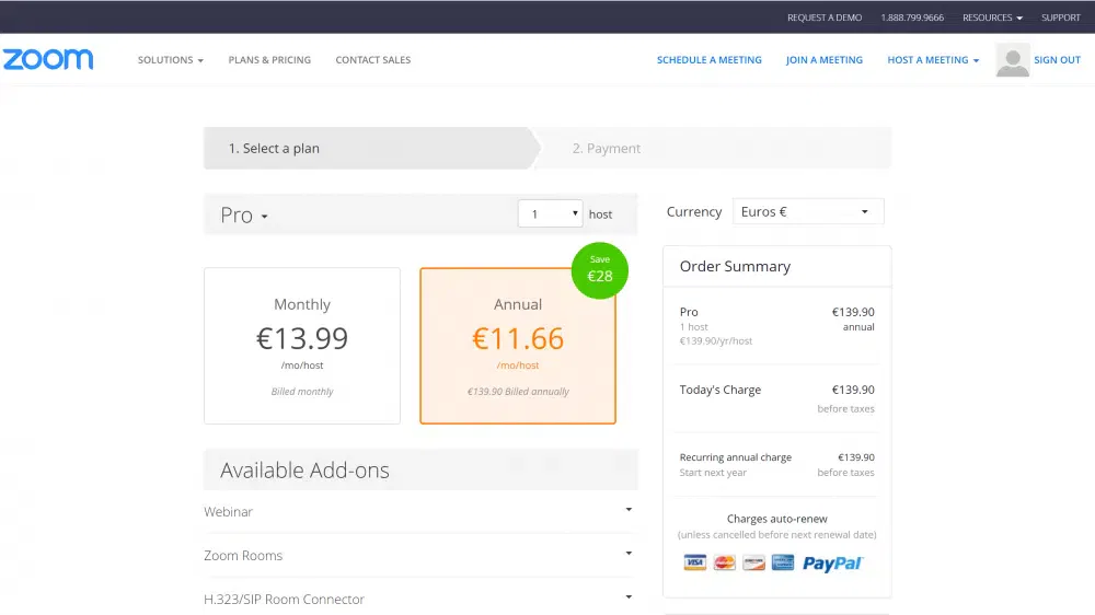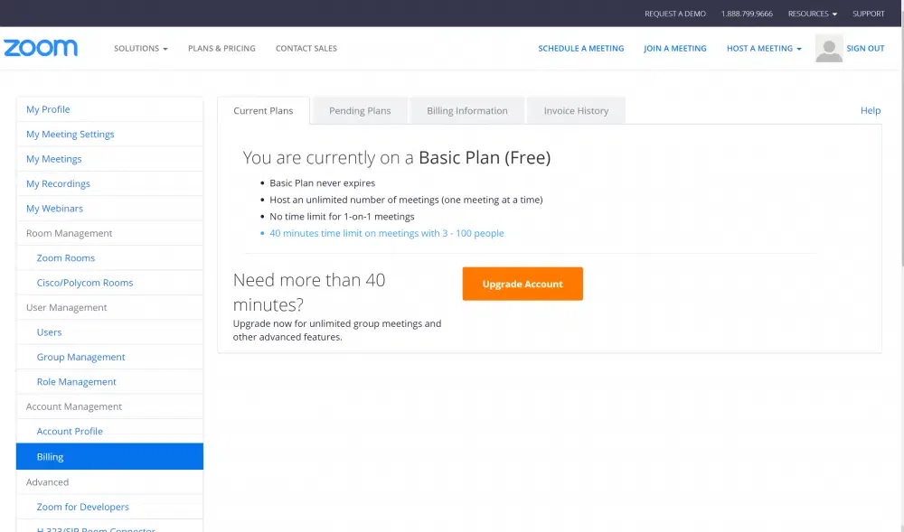 Ga in je Zoom account naar het Admin menu > Account Management > Billing om te upgraden (of te downgraden).