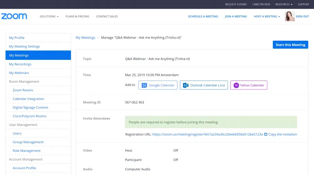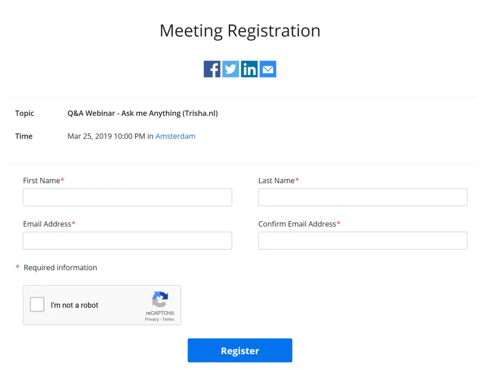 Om een inschrijfformulier voor het webinar te krijgen moet het vinkje bij <Registration> Required aan staan. Je krijgt dan een speciale link voor het inschrijfformulier waar mensen zich kunnen opgeven. Deze kan je delen in de mail, op sociale media of waar je maar wilt.