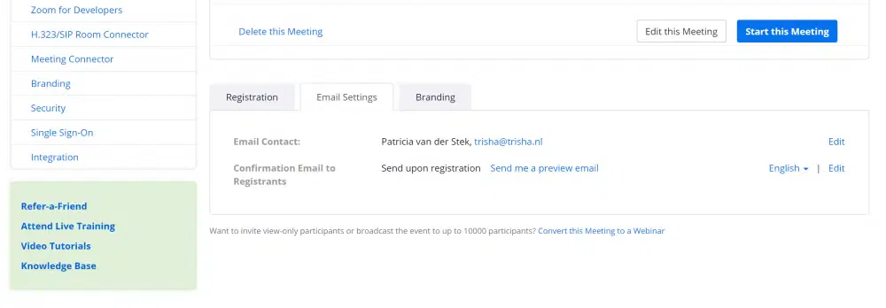Je kan je e-mailadres wijzigen in het middelste tabblad <Email Settings>. Hier zie je ook de <Confirmation Email to Registrants> staan. Op dit moment is de mail alleen beschikbaar in het Engels, maar als je op <Edit> klikt kan je zelf de rest van de mail in het Nederlands toevoegen.