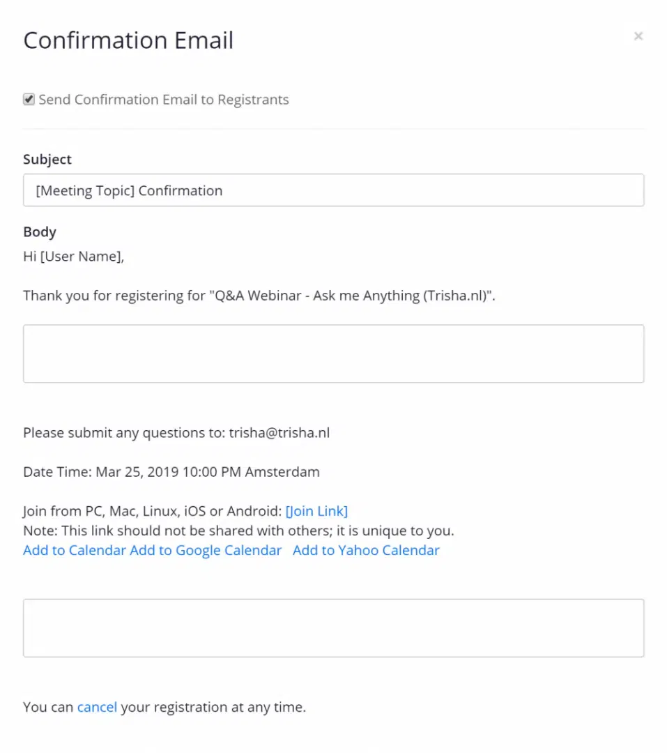Pas de gegevens aan waar je wilt en klik onderaan op <Save>. Als een deelnemer zich opgeeft voor jouw webinar, zal er automatisch een mail verstuurd worden met de inloggegevens en de mogelijkheid om het webinar aan hun eigen agenda toe te voegen.