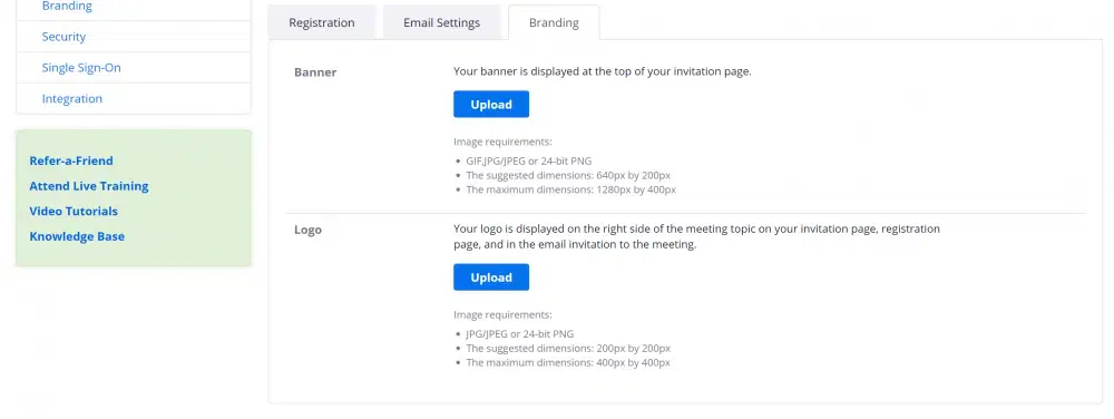 Binnen Zoom heb je ook nog de mogelijkheid om de registratiepagina te voorzien van je logo of banner. Klik hiervoor op het derde tabblad <Branding> en upload je logo of banner.