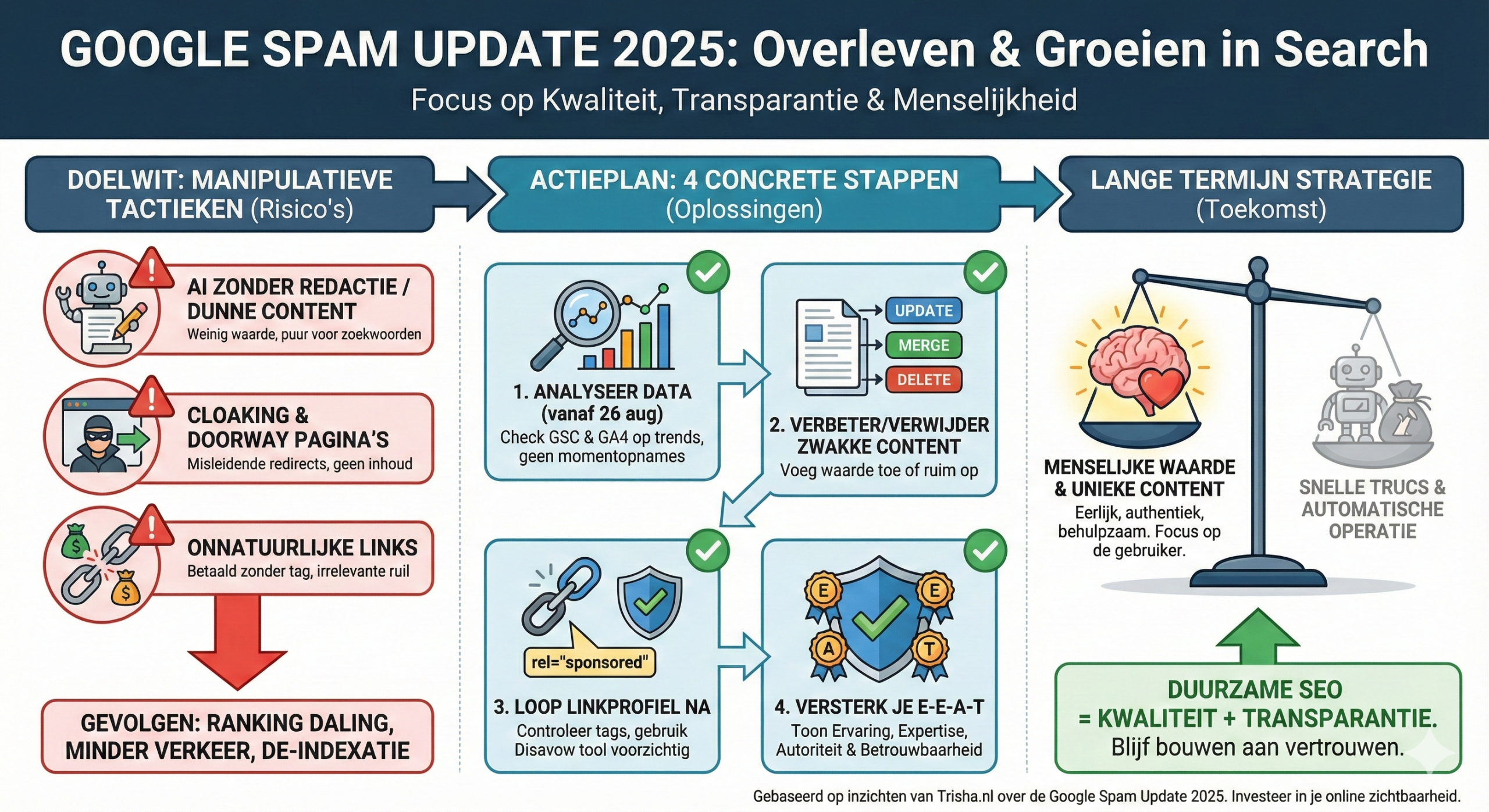 De Google Spam Update van augustus 2025 is gericht op het aanpakken van manipulatieve SEO-technieken. Je hoeft geen paniek te hebben, maar dit is wél een goed moment om: